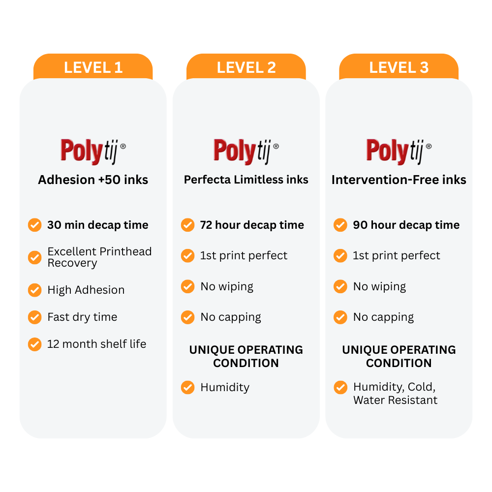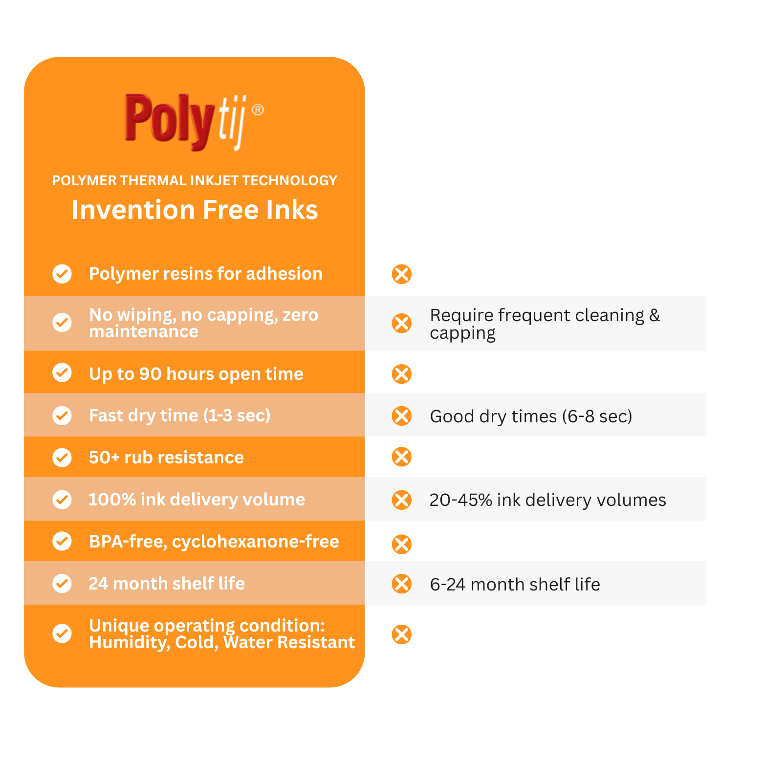 Traditional TIJ inks dry out quickly mainly due to poor kogation (Gradual and inevitable degradation), causing nozzle blockages that ruin printer cartridge uptime. POLYtij® uses advanced rheologies which incorporate polymer resins that stay primed and stable inside the printhead, even when idle — a breakthrough we call intervention free technology.